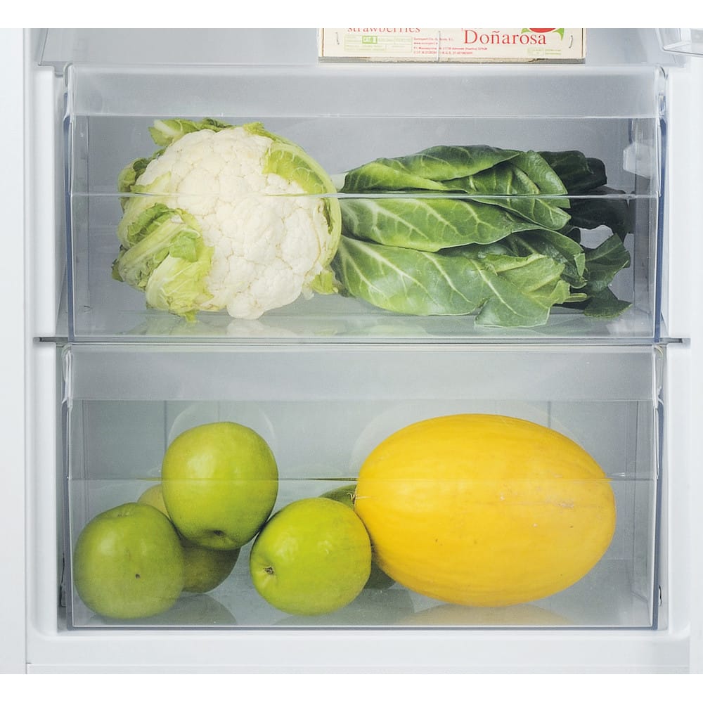 This Hotpoint Integrated Larder Fridge offers a practical solution to everyday refrigeration. It boasts an impressive 318 litres of capacity, including 5 storage shelves, a wine rack and 2 vegetable drawers. It has excellent interior ventilation, so you know your food will be stored at the optimum temperature and humidity at all times. This Hotpoint Fridge sits at a 70cm depth and fits seamlessly in with any modern kitchen cupboards.
